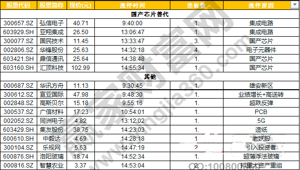 盤面上,有報道稱中國行業(yè)和監(jiān)管機構將商討推進本土芯片產業(yè)發(fā)展措施,芯片概念股逆市走強,華鋒股份(002806)四連板,弘信電子(300657)、國民技術(300077)等漲停。雄安概念股午后集體拉升,北京科銳(002350)盤中一度封板。樂視網(wǎng)(300104)再度漲停,四天三板。海南板塊大幅殺跌,海航創(chuàng)新(600555)、鈞達股份(002865)等觸及跌停,羅牛山(000735)、羅頓發(fā)展(600209)、海南瑞澤(002596)、海南高速(000886)、海峽股份(002320)等個股大跌。