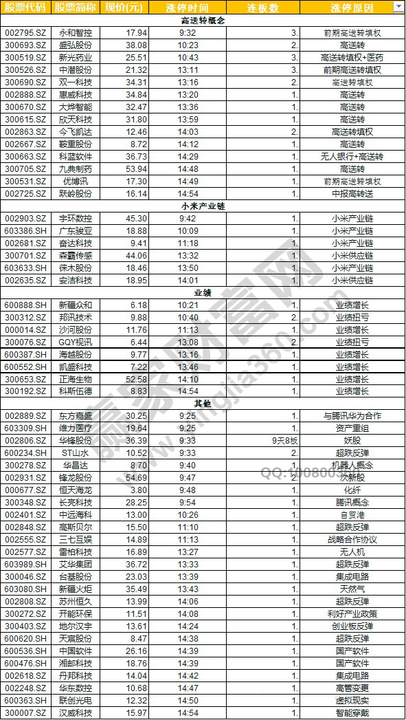 盤面上,妖股華鋒股份(002806)再度漲停九天八板。高送轉(zhuǎn)概念股午后活躍,永和智控(002795)、中潛股份(300526)、新光藥業(yè)(300519)三連板,雙杰電氣(300444)、凱輪股份、力盛賽車(002858)等個股紛紛拉升。近期開板新股鋒龍股份(002931)2連扳帶動次新走強,仙鶴股份(603733)等多股漲停,市場情緒開始逐步回暖。小米今日正式提交IPO申請文件,有望成為港交所“同股不同權(quán)”第一股,小米概念股大幅上漲,宇環(huán)數(shù)控(002903),奮達科技(002681)漲停。證券板塊逆勢拉升,華鑫股份(600621)一度沖板。ST概念股今日遭遇重挫,逾10股跌停。