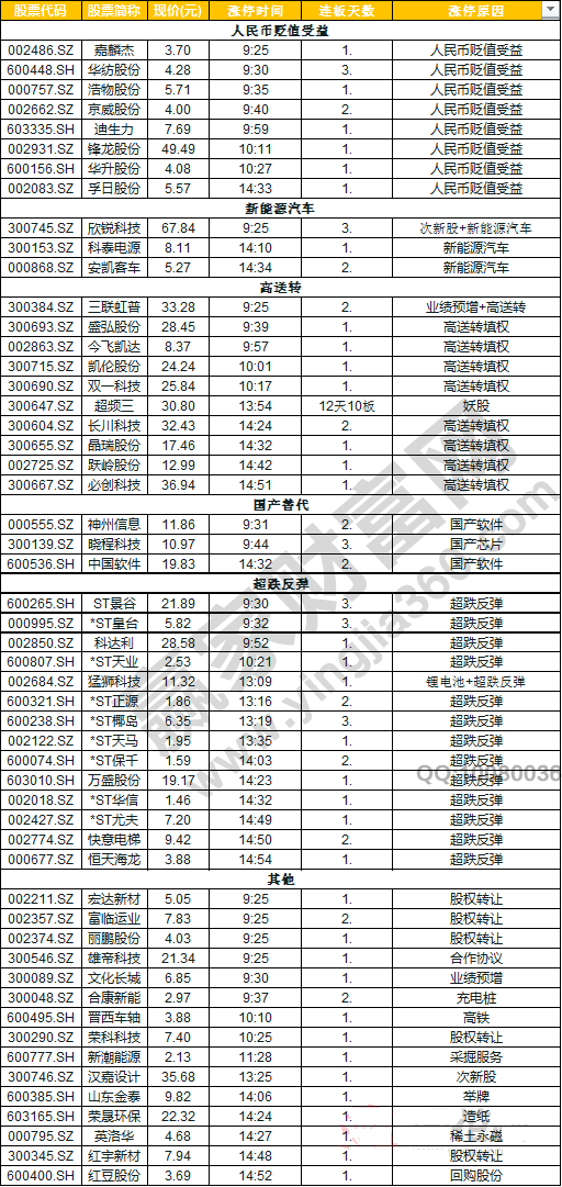 【今日除新股一字板外的漲停股】