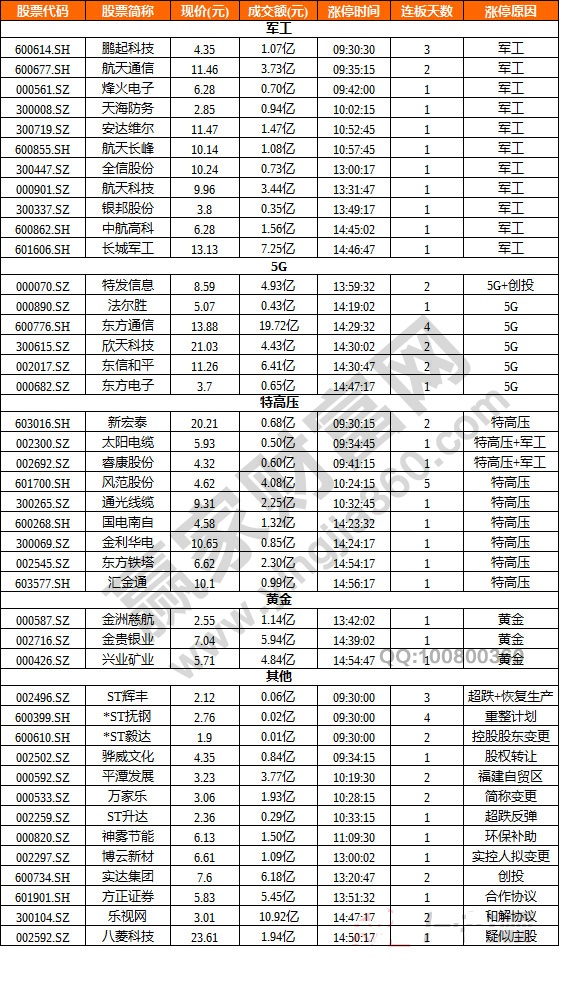 盤面上,5G板塊午后異動拉升,法爾勝(000890)、東信和平(002017)等多股漲停;軍工板塊全線爆發(fā),航天通信(600677)、航天長峰(600855)、長城軍工(601606)、烽火電子(000561)等多股集體漲停;新疆火炬(603080)、鵬鷂環(huán)保(300664)開盤跌停,昨日公告部分股東擬清倉式減持;COMEX 2月黃金期貨創(chuàng)18年6月份以來收盤新高,受此消息影響,黃金板塊快速拉升,金貴銀業(yè)(002716)、金洲慈航(000587)先后漲停。