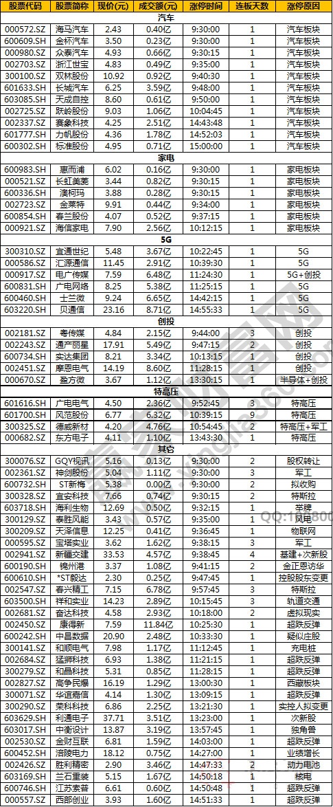 盤面上,汽車、家電板塊開盤大漲,金杯汽車(600609)、海馬汽車(000572)等多只個股漲停;5G板塊早盤走強,匯源通信(000586)、新海宜(002089)等多股強勢封板;特高壓板塊表現較為強勢,風范股份(601700)收獲九連板;創(chuàng)投板塊卷土重來,通產麗星(002243)、摩恩電氣(002451)、粵傳媒(002181)等多股漲停。