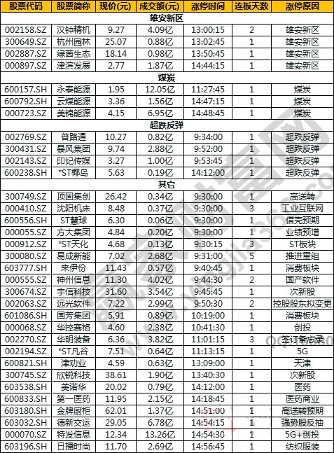 雄安新區(qū)、煤炭、超跌反彈 封板效率:一般