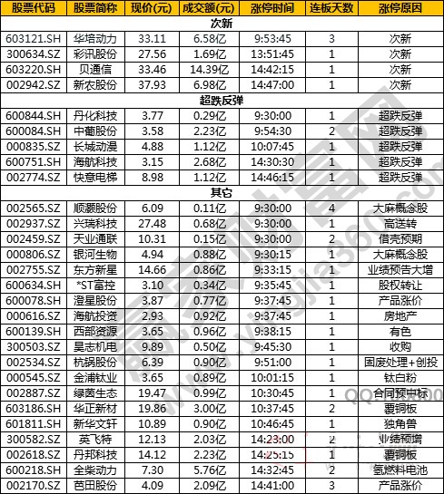盤面上,次新股成最熱門板塊,華培動力(603121)、新農(nóng)股份(002942)、興瑞科技(002937)等多股集體漲停;年報行情來襲,英菲特、東方新星(002755)等多股漲停;低價股成市場主線,近6成漲停個股股價不足10元。