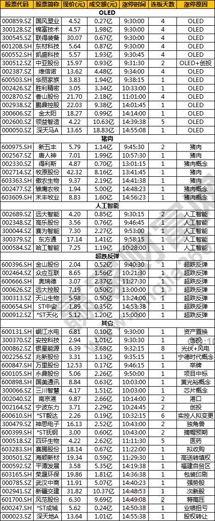 盤面上,養(yǎng)豬板塊午后持續(xù)拉升,雛鷹農(nóng)牧(002477)、得利斯(002330)、牧原股份(002714)等多股集體封板;柔性屏概念股分化,凱盛科技(600552)、維信諾(002387)、聯(lián)得裝備(300545)、國風(fēng)塑業(yè)(000859)等個股持續(xù)封板,激智科技(300566)、同興達(002845)、華映科技(000536)等紛紛走弱;石墨烯板塊早盤活躍,錦富技術(shù)(300128)、華麗家族(600503)雙雙漲停;東方通信(600776)盤中漲停,帶動5G板塊走強,貝通信(603220)一度大漲8%。
