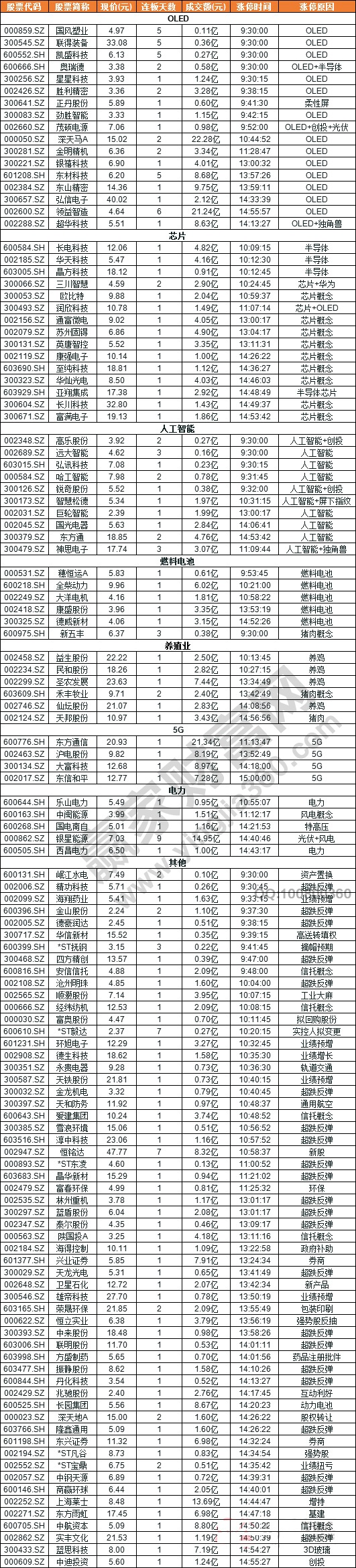 盤面上,券商板塊午后再度發(fā)力,興業(yè)證券、東興證券漲停,天風證券(601162)等多股走強;柔性屏板塊開盤分化,國風塑業(yè)(000859)、錦富技術(300128)、聯(lián)得裝備(300545)等繼續(xù)漲停,而香山股份(002870)、彩虹股份(600707)、領益智造(002600)早盤一度殺跌;豬肉概念股持續(xù)走強,新五豐(600975)繼續(xù)漲停,益生股份(002458)、牧原股份(002714)、天邦股份(002124)等個股亦跟隨上漲;芯片板塊異動拉升,長電科技(600584)領漲,華天科技(002185)、通富微電(002156)漲停,晶方科技(603005)、士蘭微(600460)等個股集體拉升。