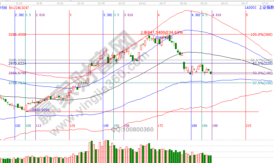時(shí)間是決定市場(chǎng)走勢(shì)最重要因素。回顧贏家江恩系統(tǒng)工具點(diǎn)評(píng)時(shí)間窗口,4月22號(hào)指出降低倉(cāng)位至3成,4月25號(hào)提示低風(fēng)險(xiǎn)者空倉(cāng)休息,5月9號(hào)時(shí)間窗口提示短線高風(fēng)險(xiǎn)可以開(kāi)倉(cāng),17號(hào)時(shí)間窗口前(15、16號(hào))提示獲利出局,這兩天提示短線周期時(shí)間窗口(23號(hào))將確認(rèn)一關(guān)鍵位,從收盤(pán)數(shù)據(jù)看,市場(chǎng)明日失守波段百分比180度2834點(diǎn),價(jià)格拐點(diǎn)將是5月第三個(gè)日線時(shí)間窗口28、29號(hào),在此時(shí)間段,無(wú)技術(shù)、無(wú)紀(jì)律者休息不要再被收割了,你是否將1季度的收益已回吐市場(chǎng)?要改變虧損的現(xiàn)狀,從擁有一套完整交易體系開(kāi)始。江恩理論研究時(shí)空運(yùn)行,通過(guò)工具預(yù)判出時(shí)間后,空間上則看趨勢(shì)工具極反通道藍(lán)色下軌線(VIP學(xué)員查看相應(yīng)位置)。日線藍(lán)色下軌線站穩(wěn)將是又一次操作機(jī)會(huì),待整固結(jié)束后市場(chǎng)必會(huì)有一波反彈到生命線行情,而這機(jī)會(huì)是留給有準(zhǔn)備的交易者。24號(hào)盤(pán)中壓力是315度2844點(diǎn)、0度2860點(diǎn),盤(pán)中支撐是225度2815、180度2800點(diǎn)。操作策略,指數(shù)擊破黑色生命線進(jìn)入弱勢(shì)區(qū)域,高風(fēng)險(xiǎn)者倉(cāng)3-4成,低風(fēng)險(xiǎn)者本周進(jìn)入備戰(zhàn)期。