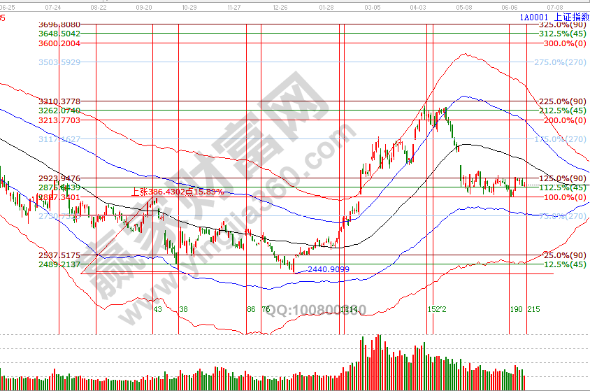 指數(shù)連續(xù)兩個交易日收盤在贏家江恩系統(tǒng)工具分析的關(guān)鍵區(qū)2880-2890之間,周一盤中擊破2880后收復(fù),此區(qū)間是江恩價格圖表四方形和60分鐘極反通道生命線,運(yùn)用多周期結(jié)合判斷,關(guān)鍵位不破保持市場延續(xù)反彈的觀點(diǎn)。如受外因不確性因素影響,波段百分比延伸線2834點(diǎn)是強(qiáng)支撐,該位置是近1個多月來箱體震蕩平臺下沿,重要性不言而喻。反彈第一目標(biāo)位2950位置,第二目標(biāo)位是日線黑色生命線,在可承受的風(fēng)險持倉內(nèi)保持平和的心態(tài)應(yīng)對市場。6月18號盤中壓力是135度2911點(diǎn)、180度2928點(diǎn),盤中支撐是0度2860、315度2844點(diǎn)。操作策略,指數(shù)處于極反通道弱勢區(qū)域的反彈走勢,繼續(xù)關(guān)注2880-2890區(qū)間得失,整體持倉保持3-5成。