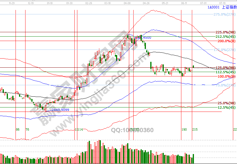 大盤跳空脫離近幾日持續(xù)談到的關(guān)鍵位,盤中最高沖擊至第一目標(biāo)位2950點(diǎn),回顧近期思路,10號(hào)早盤收復(fù)2840點(diǎn)按照規(guī)則開倉,2880-2890為持倉關(guān)鍵位,連續(xù)三個(gè)交易日收盤關(guān)鍵位,分析的觀點(diǎn)是不破延續(xù)反彈,今天盤中到達(dá)第一目標(biāo)位后,按規(guī)則賣在壓力,5成倉或以上者可以獲利部分籌碼,剩余倉位繼續(xù)持有,未來幾天關(guān)注江恩價(jià)格四方形與百分比延伸線2911-2900點(diǎn),此區(qū)間震蕩不破延續(xù)震蕩反彈動(dòng)作。6月20號(hào)盤中壓力是225度2944點(diǎn)、180度2928點(diǎn),盤中支撐是90度2894點(diǎn)。操作策略,指數(shù)處于極反通道弱勢區(qū)域的反彈走勢,繼續(xù)關(guān)注2911-2900區(qū)間不破延續(xù)反彈,整體持倉保持3成左右。