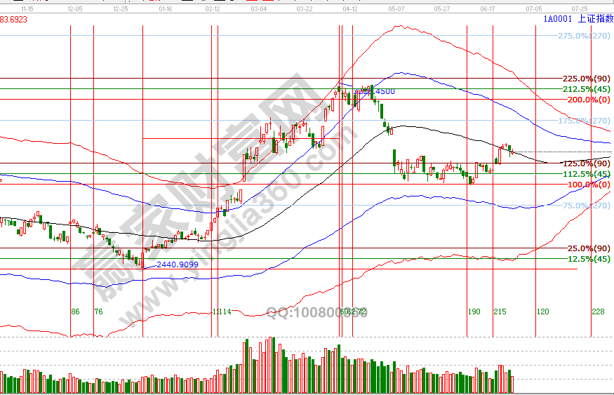 市場(chǎng)走勢(shì)同20號(hào)分析一致,圍繞日線(xiàn)極反通道黑色生命線(xiàn)上下震蕩,按歷史規(guī)律,自下向上的突破生命線(xiàn)需要量能及3天時(shí)間確認(rèn),指數(shù)收盤(pán)價(jià)一直在生命線(xiàn)上,不足之處是量能出現(xiàn)持續(xù)萎縮,27號(hào)江恩時(shí)間窗口盤(pán)中關(guān)鍵位2966點(diǎn),結(jié)合周期關(guān)系,整體還處于反彈周期內(nèi),6月27號(hào)盤(pán)中壓力是0度2997點(diǎn)、45度3016點(diǎn),盤(pán)中支撐是2966點(diǎn)、2944點(diǎn)。操作策略,指數(shù)圍繞極反通道生命線(xiàn)震蕩,延續(xù)反彈走勢(shì)中,整體持倉(cāng)保持3-5左右,7月3號(hào)時(shí)間窗口選擇方向。