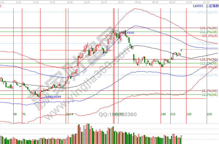 2840點(diǎn)一直是5、6月份贏家江恩大勢(shì)分析中強(qiáng)調(diào)的位置,同時(shí)江恩輪中輪時(shí)空分析一直未改變的觀點(diǎn)是60度2847點(diǎn)不破,按循環(huán)空間可以看到3051點(diǎn),指數(shù)已接近此點(diǎn)位,月線黑色生命線是3067點(diǎn),3051-3067所構(gòu)建的區(qū)間從工具判斷不在適合大舉開新倉,指數(shù)上攻超200點(diǎn),按買在支撐賣在壓力原則,指數(shù)未來越上攻應(yīng)以分批獲利兌現(xiàn)為主,3051-3067區(qū)間過后是日線藍(lán)色上軌線反壓。7月2號(hào)盤中壓力是135度3055點(diǎn)、180度3067點(diǎn),盤中支撐是90度3036點(diǎn)、45度3016點(diǎn),7月時(shí)間窗口是3(4)、15、23(24)號(hào);操作策略,指數(shù)極反通道生命線上安全區(qū)域震蕩,反彈動(dòng)作還在延續(xù),3051-3067區(qū)間附近高倉位可以分批兌現(xiàn)利潤,整體持倉保持3-5成。