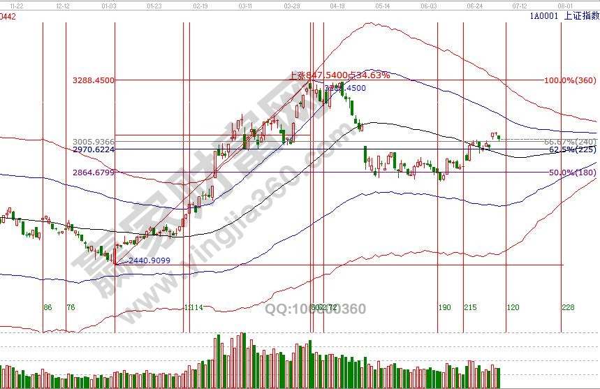 A股3、4號時間窗口及3051-3065極反通道多周期共振反壓位,時間與空間的解讀在6月28號及1號在分析中有闡述,同時今天收盤價3015與工具測算位置僅僅相差一個點。目前短周期的周期共振警示還沒有解除,2號盤中在贏家江恩系統(tǒng)學員區(qū)已談到共振會引起傳遞,目前市場正在按預期逐級回踩確認短期生命線,回撤期間有參考意義的位置是60分鐘生命線,贏家學員們可以結合工具盤中跟蹤等待信號確認。整體上工具還未給出反彈結束信號,同時這里也不具備大幅開倉條件,提高止賺位保持一定持倉做應對,7月4號盤中壓力是135度3055點、90度3036點,盤中支撐是0度2997點、315度2978點。操作策略,指數極反通道生命線上安全區(qū)域震蕩上攻,反彈動作還在延續(xù),3051-3067區(qū)間附近高倉位可以分批兌現利潤,整體持倉保持3-5成。