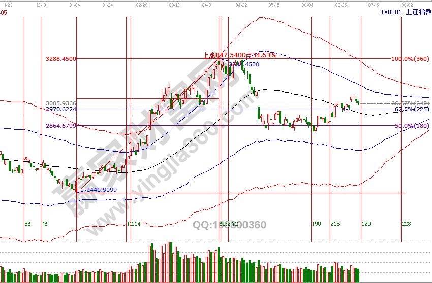 2號(hào)午盤在贏家江恩系統(tǒng)學(xué)員區(qū)及當(dāng)日收盤分析中,講述了通過極反通道判斷出的短周期周期共振警示信號(hào),所提出結(jié)論目前正在一步步得到市場(chǎng)的確認(rèn),逐級(jí)回踩生命線,這也是近兩日一直談到不讓開新倉(cāng)的技術(shù)依據(jù),短期警示信號(hào)是結(jié)束還是展開新的周期修整,將于今天見分曉。整體上2840附近所展開的反彈還沒有結(jié)束,短線具有參考價(jià)值就是60分鐘的生命線位置。,7月5號(hào)盤中壓力是45度3016點(diǎn)、90度3036點(diǎn),盤中支撐是315度2978點(diǎn),下個(gè)時(shí)間窗口是15號(hào)。操作策略,指數(shù)極反通道生命線上安全區(qū)域震蕩上攻,反彈動(dòng)作還未結(jié)束,短線關(guān)注2978-2983位置,整體持倉(cāng)保持3-5成。