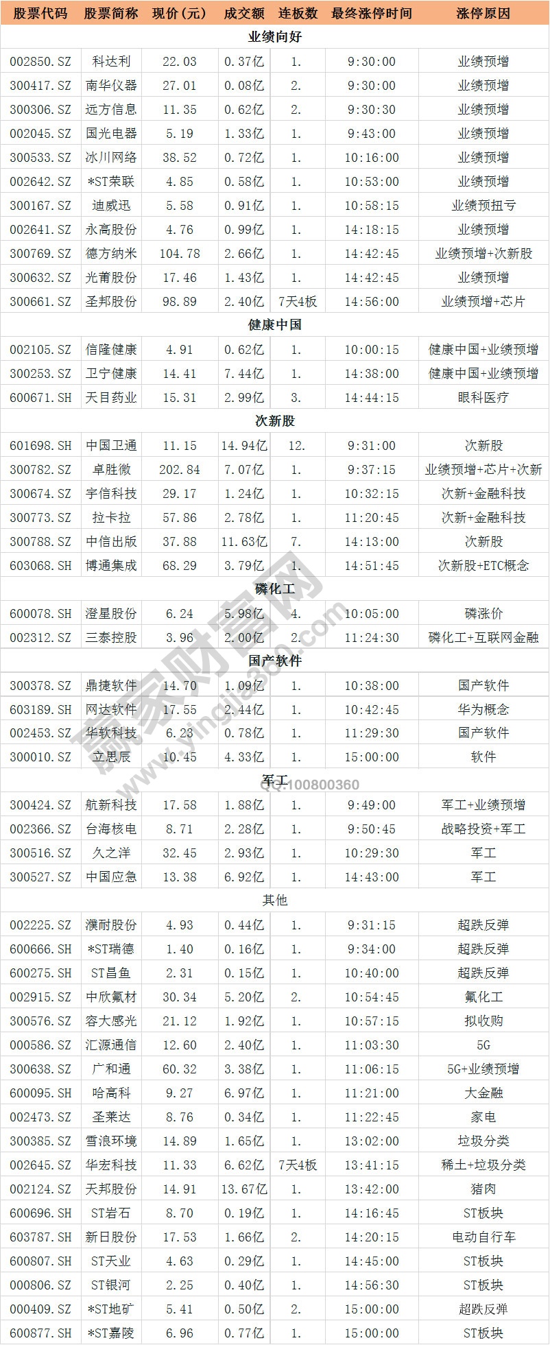 盤面上:養(yǎng)殖股午后明顯走強(qiáng),天邦生物漲停,大北農(nóng)(002385)、牧原股份(002714)集體漲超5%;廣電系板塊異動(dòng),廣電網(wǎng)絡(luò)直線沖板,廣西廣電(600936)、貴廣網(wǎng)絡(luò)(600996)跟漲,消息面上:陜西廣電網(wǎng)絡(luò)與華為簽訂戰(zhàn)略合作協(xié)議;中船系板塊全天領(lǐng)漲,中國(guó)應(yīng)急(300527)、久之洋(300516)漲停,帶動(dòng)軍工股一度走高;金融科技及國(guó)產(chǎn)軟件概念股表現(xiàn)活躍,華軟科技(002453)、網(wǎng)達(dá)軟件(603189)、宇信科技(300674)等多股漲停;澄星股份(600078)4連板走出市場(chǎng)高標(biāo)、天目藥業(yè)(600671)3連板。