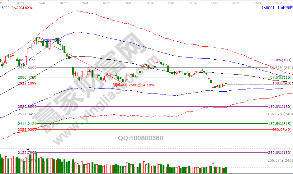 6號開盤前贏家江恩系統(tǒng)VIP學員區(qū)發(fā)周期共振圖,指數(shù)觸及極反通道藍色下軌線2744點后激進者開倉,并于當天收盤分析中給出反抽目標位是波段百分比延伸線180度2834附近,今日指數(shù)高開上攻正好到13號分析的反壓位2829點回落,學員區(qū)繼12號提示分批第一次減倉獲利后,今日早盤觸及15分鐘藍色上軌線再度做圖分析達到獲利了結(jié)條件。隨著時間窗口、目標價臨近,代表價格將再會進入一次較大波動期,另外早盤談到科技股短期高點形成,激進者剩余最后一批倉可以以百分比延伸線120度2791為參考線。8月15號盤中壓力是225度2815點、270度2829點,盤中支撐是135度2786點、90度2772點,本周五日線時間窗口。操作策略,指數(shù)生命線下弱勢區(qū)運行,激進者3成倉交易,穩(wěn)健者空倉休息。