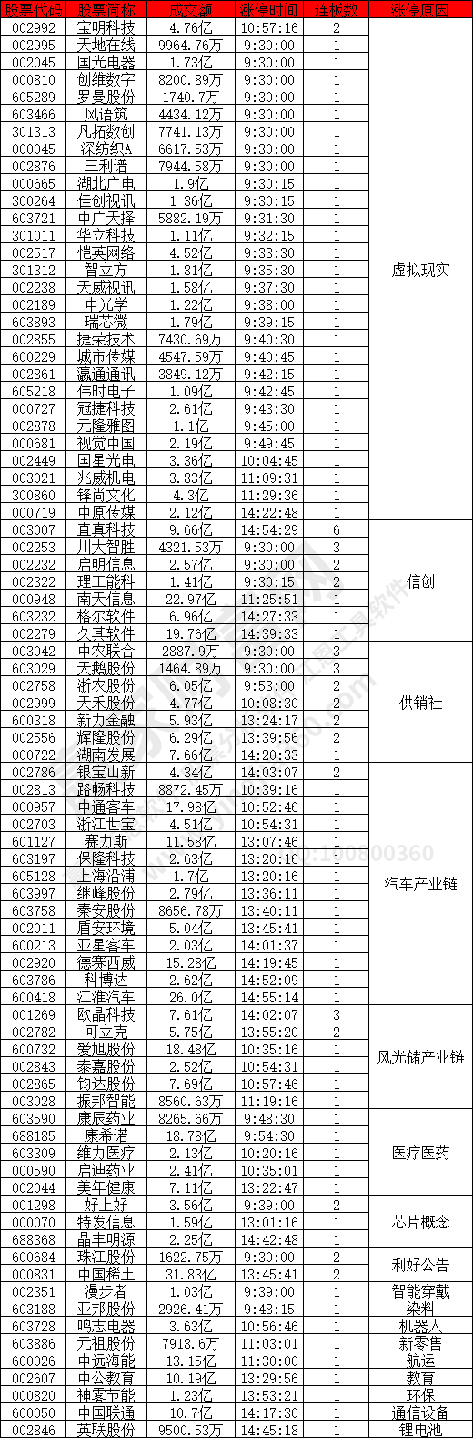 盤面上,汽車整車午后持續(xù)拉升,中通客車(000957)、賽力斯(601127)、亞星客車(600213)漲停,江淮汽車(600418)、漢馬科技(600375)、長安汽車等跟漲。供銷社概念板塊午后拉升,新力金融(600318)、輝隆股份(002556)午后封板,天鵝股份(603029)、中農(nóng)聯(lián)合(003042)3連板,浙農(nóng)股份(002758)、天禾股份(002999)此前漲停,中農(nóng)立華(603970)、浙江東日(600113)、敦煌種業(yè)(600354)等紛紛大幅沖高。新冠治療概念沖高回落,翰宇藥業(yè)(300199)打開漲停板,君實(shí)生物大幅回落,眾生醫(yī)藥、以嶺藥業(yè)(002603)等紛紛回落。