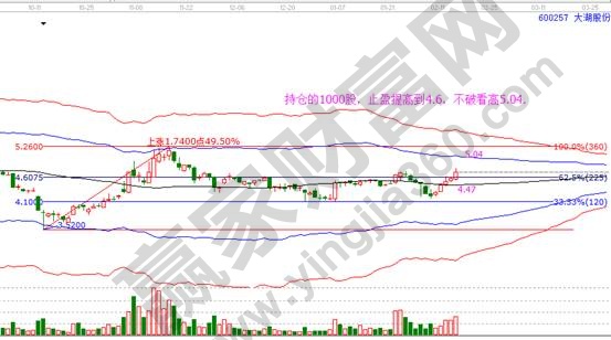 1. 大湖股份1000股持倉,當前在生命線上方走勢穩(wěn)健,生命線位置4.47不破屬于強勢,短線及賬戶的情況,建議止盈提高到225度支撐4.6,4.6不破,持股看高5.04;4.6擊穿,獲利出局,資金和精力放在被套個股上。