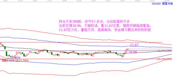 2. 國星光電,持倉只有300股,浮虧5個多點,倉位輕套的也不多。股票在生命線上震蕩運行,走勢穩(wěn)健,10.96是當前支撐點,可以此位置做止損,不破看高11.67,屆時再定。