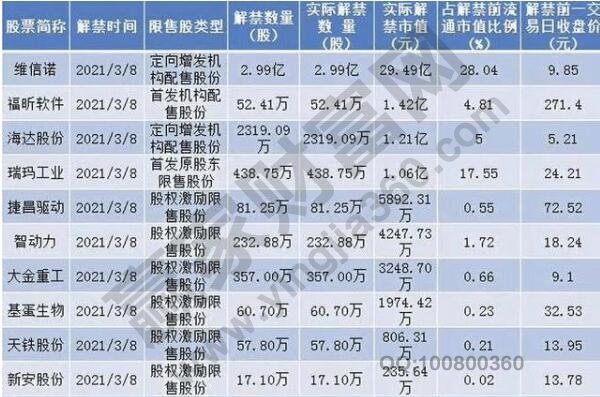 其中,有四只股票解禁市值超億元,分別是福昕軟件解禁市值1.42億元,52.41萬股,占比前流通市值4.81%;海達股份解禁市值1.21億元,2319.09萬股,占比前流通市值5%;維信諾解禁市值29.79億元,2.99億股,占比28.04%;、瑞瑪工業(yè)解禁市值1.06億元,438.75萬股,占比前流通市值17.55%。定向增發(fā)機構配售股份是海達股份,維信諾,首發(fā)原股東限售股份是瑞瑪工業(yè),福昕軟件。