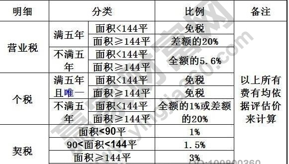 個(gè)人所得稅:滿五年,是可以免除的,如果不夠五年,那么就要按照房價(jià)漲幅的20%或者成交價(jià)的1%交納;