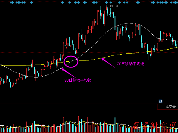 上圖為30日移動平均線和120度移動平均線,屬于中長期的移動平均線,在兩條平均線交叉的時候,此票已有一段漲幅。但此時依然是本輪上漲行情的起始位置,且在黃金交叉出現前,伴隨股價的上漲,成交量也逐漸增長,所以,投資者依然可以追逐到后面的漲幅。