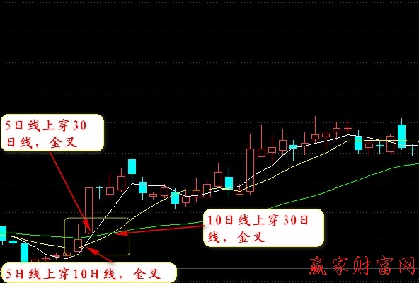 當(dāng)在股市中出現(xiàn)了黃金交叉的現(xiàn)象的時候,那么將預(yù)示著股價會持續(xù)上漲。在下圖中,我們看到5日均線上穿10日均線形成的交叉,10日均線再上穿30日均線形成的交叉,底部出現(xiàn)的三角形,此時就形成了黃金交叉的形態(tài)。