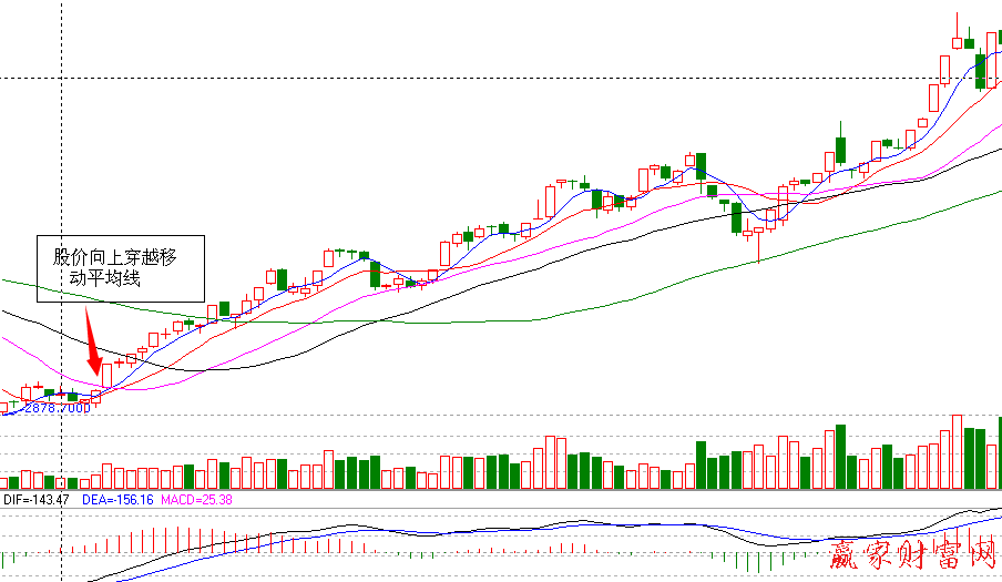 在股市中,移動(dòng)平均線(xiàn)代表了在這一交易時(shí)段內(nèi)的平均持有成本。能夠熟悉均線(xiàn)理論并將其應(yīng)用于實(shí)際中,會(huì)為交易提供很大的方便。下圖為上證醫(yī)藥日K線(xiàn)圖,圖中的移動(dòng)平均線(xiàn)能夠很好地體現(xiàn)出短期走勢(shì),股價(jià)在箭頭所指方向開(kāi)始上揚(yáng),成交量也逐漸加大。這標(biāo)志著未來(lái)很有可能將繼續(xù)上漲,因此在移動(dòng)平均線(xiàn)剛剛被穿越時(shí),是一個(gè)非常好的買(mǎi)入點(diǎn)。