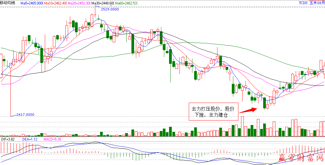 有的主力為了在建倉時(shí)獲得更低的價(jià)格,往往采取打壓建倉的模式。這種方法是莊家利用前期持有的一部分籌碼向下打壓股價(jià),迫使散戶認(rèn)為股價(jià)沒有到達(dá)市場(chǎng)底部還會(huì)進(jìn)一步向下跌落,因此紛紛賣出手中的股票,而主力機(jī)構(gòu)則在相對(duì)低廉的價(jià)位買到了散戶的拋出盤。當(dāng)股價(jià)真正達(dá)到更低價(jià)位后,由于主力機(jī)構(gòu)在前期已經(jīng)吸納足夠的籌碼,因此股價(jià)也不會(huì)在市場(chǎng)的底部停留過多時(shí)間。而投資者只要能狗在移動(dòng)平均線向上發(fā)散之時(shí)買入股票,就能夠很好地跟著主力進(jìn)行交易。