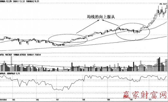 在股價(jià)長期上升過程的中途,當(dāng)各類短期均線的運(yùn)行方向都向下調(diào)整,中期均線開始走平,而各類長期均線仍然強(qiáng)勁上行,此時(shí)股價(jià)走勢的變盤方向一般是要服從長期均線。即當(dāng)各類短期均線向下靠近長期均線時(shí),會遇到長期均線的有力支撐而重新翻身向上。不過,對于小部分前期漲幅已經(jīng)非常大的股票,其股價(jià)走勢變盤的方向可能也會向下,這時(shí),就應(yīng)密切關(guān)注股價(jià)的走勢是不是真正發(fā)生改變。如圖所示。