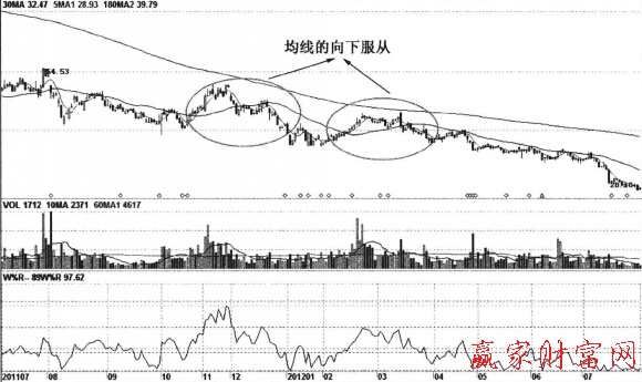在股價(jià)長期下降過程的中途,當(dāng)各類短期均線多頭排列的運(yùn)行方向都向上反彈,中期均線開始走平,而各類長期均線仍然持續(xù)下行,此時(shí)股價(jià)走勢的變盤方向一般是要服從長期均線。當(dāng)各類短期均線向上反彈、靠近中長期均線時(shí),會遇到中長期均線的強(qiáng)大壓力而重新翻身向下。如圖所示。