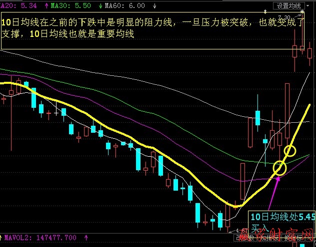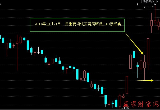 我們僅以MA(簡單移動平均線)為例,參考常用軟件上默認(rèn)的參數(shù):5、10、20、30、60、120、240天。那么該怎么使用呢?我們在做T+0中只使用重要均線。什么是重要均線呢?重要均線是指現(xiàn)在至過去的一段時間里,對股價有明顯規(guī)律的那一條或多條均線就是我們所說的重要均線。那條均線對股價有明顯的支撐或者壓力就是對股價有明顯規(guī)律。利用重要均線對股價的支撐或壓力,我們做T+0就可根據(jù)此來買賣了。