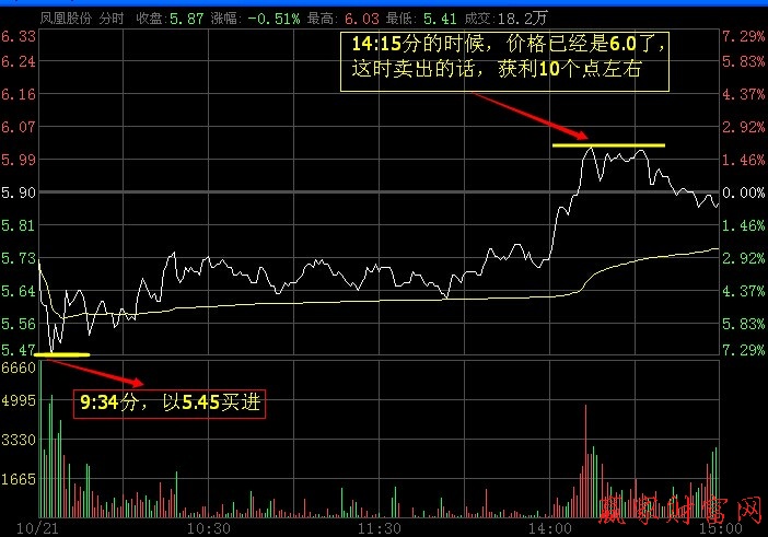這只票是很好做T+0的,幾乎那幾天都可以做,我們將該圖放大,并以10月21日為例,看看咱們應(yīng)該具體怎么操作。從下圖中可以看出,該股近期10日線是重要的阻力線,那么突破后也就變成了重要的支撐了。我們就是要通過10日均線進行買賣,在均線處位置買入,持股獲利后即可出局,但要記住我們是做的T+0,是日內(nèi)買賣,獲利后必須通過不斷提高止盈位保護到手的收益,從中我們可以看出若從10日均線的5.45位置買入,哪怕是在5.9這個位置出局,我們?nèi)阅塬@利8個多點的收益((5.9-5.45)/5.45=8.3%)。很明顯,比我們持倉待漲要強很多。