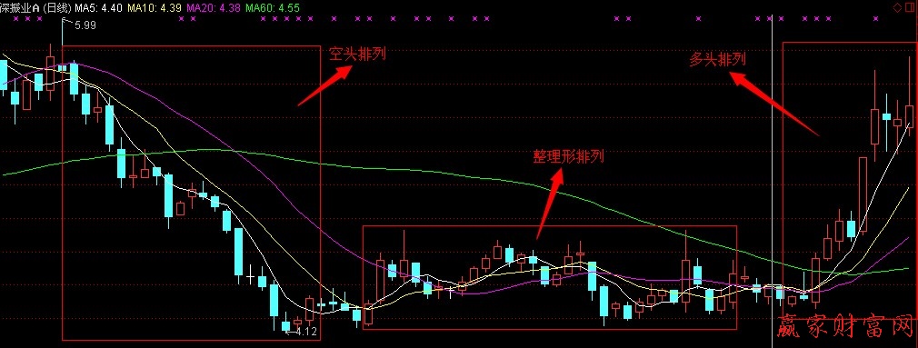 投資者都知道,均線是有不同的時間周期的,根據(jù)時間周期的不同,可以大體的將其分為短期均線、中期均線和長期均線三類。觀察均線之間的運動關(guān)系,實際時就是觀察短期均線、中期均線和長期均線直接的排列關(guān)系。
