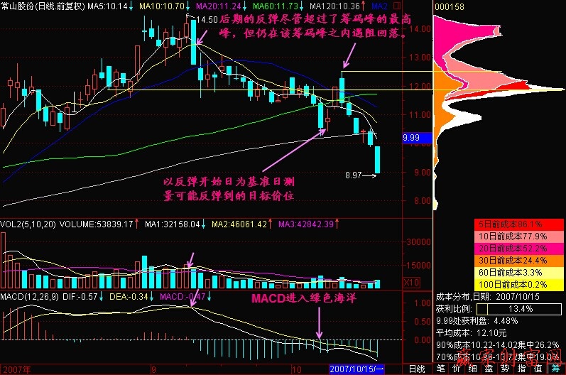 當(dāng)市場下跌至最近的籌碼峰時,就有可能發(fā)生反彈。此時,市場會反彈至上方的第一個籌碼峰。而當(dāng)市場反彈至籌碼峰時,能量就很容易被消耗掉。如果市場繼續(xù)拉升,籌碼峰里的套牢盤就會解套,因此市場繼續(xù)拉升就會很乏力。