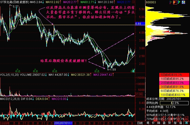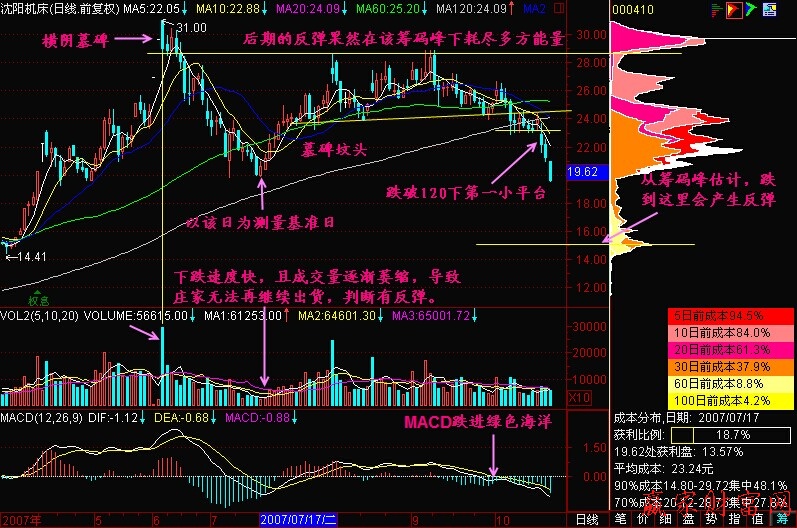 小結(jié):市場一旦筑頂后進入下跌通道,任何的反彈都是賣出的良機。一般而言,當(dāng)市場反彈治前期頭部籌碼峰下巖時,就會遇到拋壓,只要反彈在籌碼峰下反彈無力,就應(yīng)及時清倉出局。