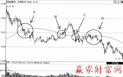 包鋼股份(600010)的日K線圖,圖中顯示的是60日均線,在A處,股價(jià)通過快速下跌的方式跌破60日均線,在這里經(jīng)過兩次反彈也沒有再次突破60日均線,從而股價(jià)繼續(xù)下行。但這時(shí)60日均線還是向上走的,所以后面應(yīng)該還有機(jī)會(huì)。