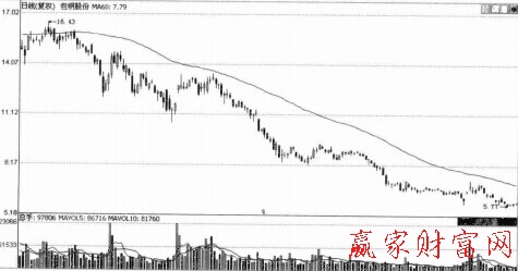 在60日均線下,股價(jià)經(jīng)過反復(fù)震蕩,出現(xiàn)了W底形態(tài),但要注意60日均線開始走平,在B處股價(jià)突破60日均線而上行,但在前期高點(diǎn)附近再次受到壓制,從而造成股價(jià)又開始大幅下滑,在C外又突破了60日均線,注意這時(shí)60日均已是走平,所以后市機(jī)會(huì)應(yīng)該很少,投資者一定要清倉走人,在相當(dāng)長(zhǎng)的時(shí)間內(nèi)不要再碰該股。