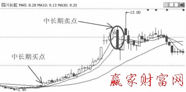 四川長(zhǎng)虹(600839)的周K線圖,在多頭排列的情況下,沿著5周均線進(jìn)行買進(jìn),然后一直持有,等股價(jià)跌破5周均線時(shí)賣出,就會(huì)獲利豐厚,如圖所示。