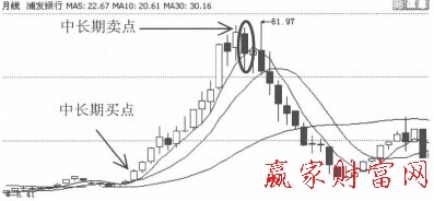 浦發(fā)銀行(600000)的月K線圖,在多頭排列的情況下,沿著5月均線進(jìn)行買進(jìn),然后一直持有,等股價(jià)跌破5月均線時(shí)賣出,就會(huì)獲利豐厚,如圖所示。