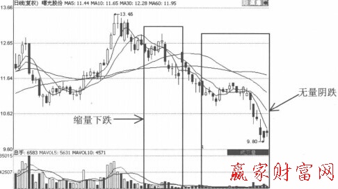 上圖是曙光股份(600303)的日K線圖與成交量,在這里可以看到下跌初期的縮最下跌,下跌途中的無量陰跌。