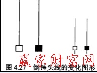 錘頭線有陽線錘頭與陰線錘頭之分.作用意義相同.但陽線錘頭力度要大于陰線錘頭。激進型投資者見到下跌行情中的錘頭線.可以試探性地做多;穩(wěn)健型投資者可以多觀察幾天.如果股價能放量上升??梢赃m量做多。錘頭線的交化圖形如圖4.26所示。