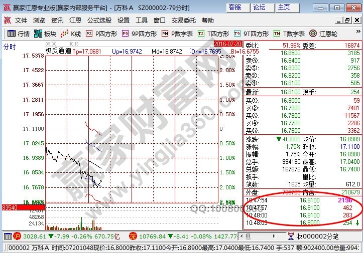 上圖是萬(wàn)科A在昨天交中的分時(shí)走勢(shì),圖中在10.47分中有的識(shí)貨有一筆大膽2196。為什么會(huì)有這樣的走勢(shì)?大家可能會(huì)想到:主力自己和自己交易。這是對(duì)倒的情況,它的直接作用就是拉高股價(jià),投資者如果繼續(xù)觀察就會(huì)發(fā)現(xiàn)在之后的交易中比較活躍,成交量也會(huì)明顯增多,股價(jià)出現(xiàn)上漲的情況。但股市是不可能因?yàn)閽靻蔚耐蝗辉龆嗑陀泻芏嗟馁I(mǎi)單或者是賣(mài)單,因此,主力把掛單一直放在那二是毫無(wú)意義的,這也是在前面所提到的主力自己進(jìn)行交易的原因。