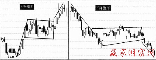 顧名思義,旗形走勢的形態(tài)就像一面掛在旗桿頂上的旗幟。這種形態(tài)通常在急速而又大幅波動(dòng)的市場中出現(xiàn)。股價(jià)經(jīng)過一連串緊密的短期波動(dòng)后,形成一個(gè)稍微與原來趨勢呈相反方向傾斜的長方形,這就是旗形走勢。旗形走勢又可分為上升旗形和下降旗形。