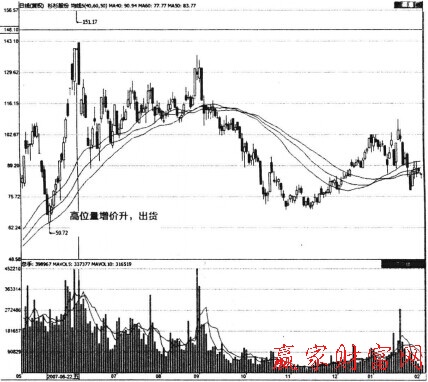 上圖是杉杉股份(600884)在2007年下半年的走勢(shì)圖。在6月22日該股高位放量,而最終幾乎收平盤,這是主力出貨的一種表現(xiàn)。