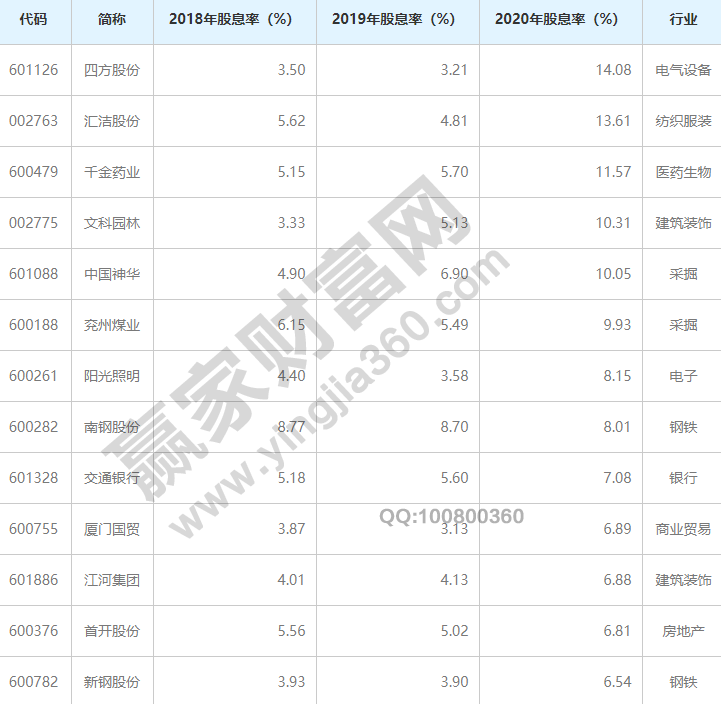 五年均值前10名,股息率區(qū)間為10.9%-5.8%: