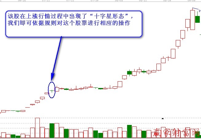 在股價經(jīng)過一波快速下跌的行情后,股票在某一價位企穩(wěn)反彈,股價開始上漲。在上漲的初級或中級階段,某一天,股價出現(xiàn)了開盤后即上下劇烈震蕩,最后尾盤收盤價與開盤價相當(dāng),形成一根標(biāo)志性的十字星形態(tài)的K線。我們稱之為上升行情中的十字星形態(tài)。