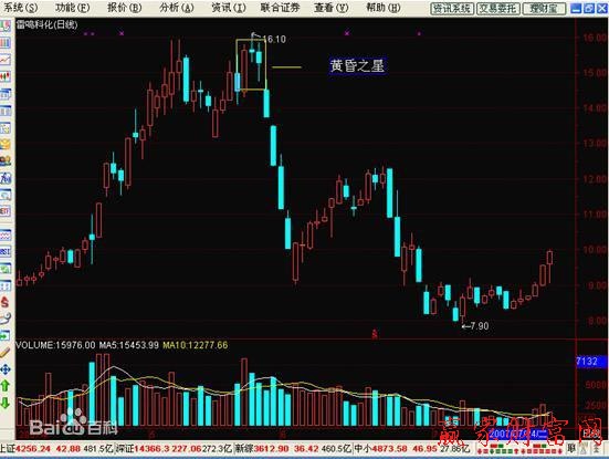 “黃昏之星”(如下圖)又可以被稱為“夜星”,一般出現(xiàn)在k線的頭部,因此它屬于k線圖中的