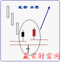 “棄嬰形態(tài)”(如下圖)通常是由三根蠟燭線組成,中間一根為十字星線,并且在這根十字星線與其前后兩根蠟燭線之間。從形態(tài)上看,它與前后的股價連續(xù)發(fā)展格格不入,仿佛掉隊的士兵,被遺棄的嬰兒一樣,故此得名。從圖中,我們可以發(fā)現(xiàn)股價出現(xiàn)了價格跳空的現(xiàn)象,并且此種形態(tài)通常會出現(xiàn)在頂部或者是底部,它是一種發(fā)轉(zhuǎn)信號。由于此形態(tài)出現(xiàn)的位置不同,因此可以分為底部“棄嬰形態(tài)”以及頂部“棄嬰形態(tài)”。通常來說,底部“棄嬰形態(tài)”將會預示著股價上升,而頂部底部“棄嬰形態(tài)”將會預示股價會下跌。