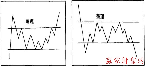 多頭市場里,上升行情亦會發(fā)生回檔整理,并且經(jīng)過換手而使股價脫離盤局繼續(xù)上漲。空頭市場則反之,下跌行情出現(xiàn)反彈,無力上升時,股價突破盤局下端又跌一段。也就是說,股價行進方向未受短暫的干擾而改變其持續(xù)性,最后,原來掌握優(yōu)勢的一方重新居于上風(fēng)。中間停留的盤檔走勢稱之為整理(如下圖)。