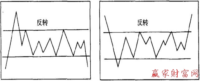 股價變動并非一成不變的,受客觀與主觀環(huán)境改變,原居優(yōu)勢的一方會在盤檔行情的末期失去控制權(quán),使股價運動方向發(fā)生絕對性的改變,亦即由上升行情轉(zhuǎn)為下跌行情,從原本不斷創(chuàng)新高價的走勢轉(zhuǎn)變成股價日趨下游。抑或由下跌行情轉(zhuǎn)為上升行情,從原本不斷出現(xiàn)新低價的走勢轉(zhuǎn)變成股價不斷向上竄升,脫離盤檔行情稱為反轉(zhuǎn)(如下圖)。