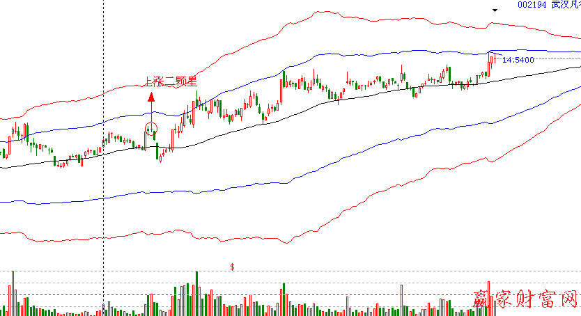 上漲二顆星的出現表明漲勢仍會繼續(xù),股價很有可能在短期內展開新一輪的升勢。因此,投資者見此K線組合后可適量增加倉位,持股待漲。